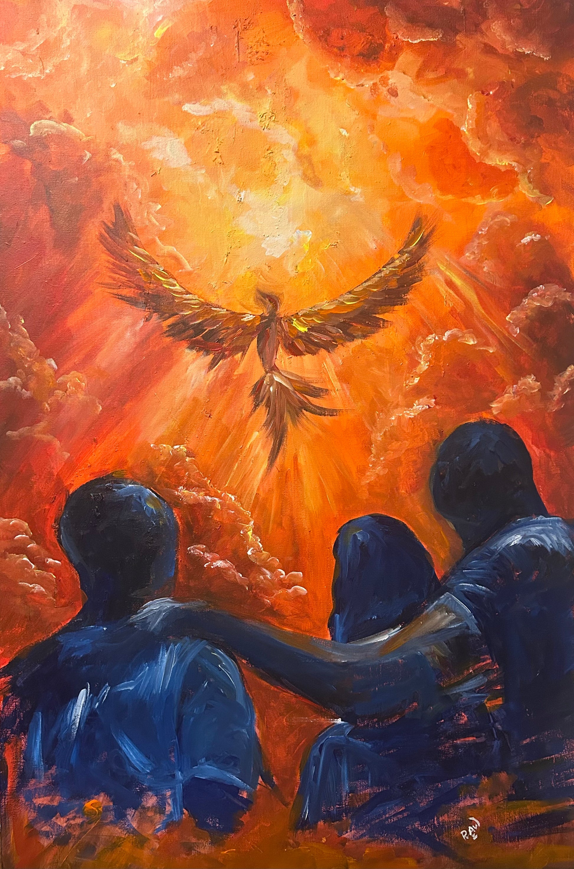 Typically, the phoenix is depicted emerging from the embers and ashes made anew. Here, we have silhouettes of stillness. In prayer, touching one other. The communal aspect depicted here from which the Phoenix has rose from is intentional. Instead of ashes, the visual representation of interpersonal relationships is what has revived the Phoenix. We learn so much from our relationships. About ourselves. What are strengths are down to our weakness. Relationships teach us things good and bad. Relationships can also be a foundational rock for uplifting us and seeing us through our battles.